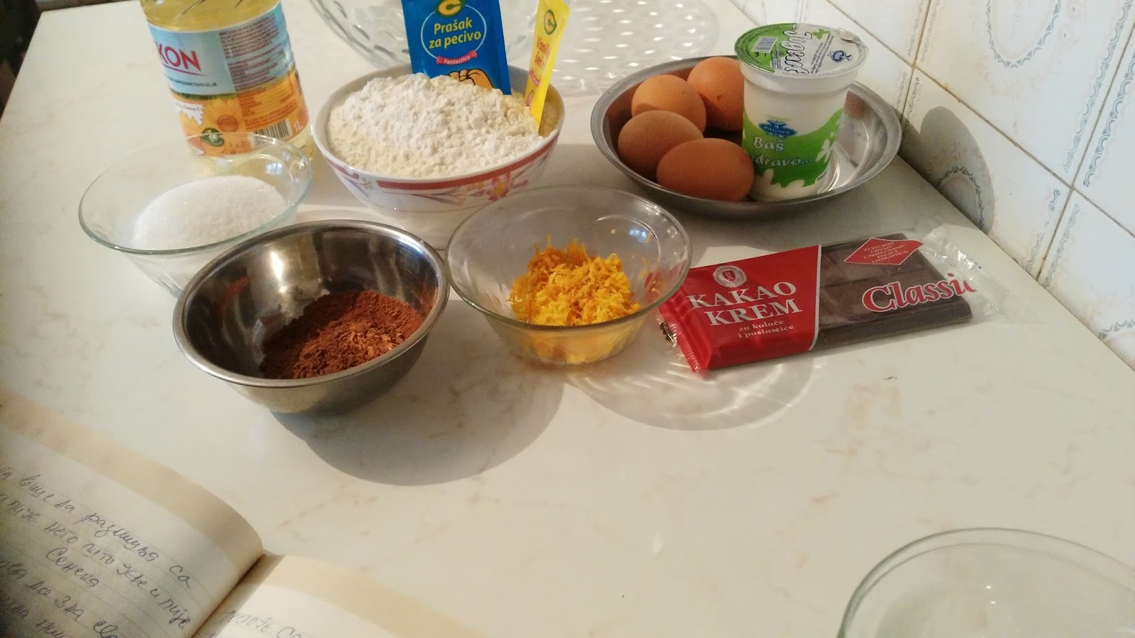 Prašak za pecivo izmešati sa prašnom pa dodati. Zatim sipati jogurt, ulje, koricu narandže i vanilin šećer.Sve sjediniti.