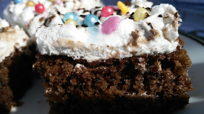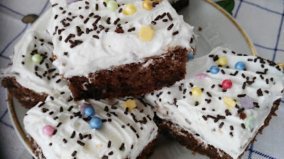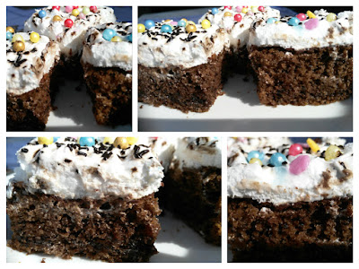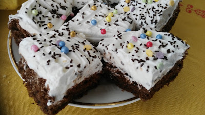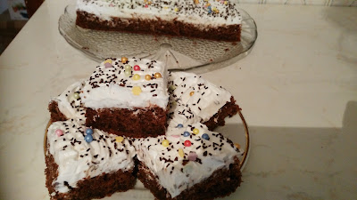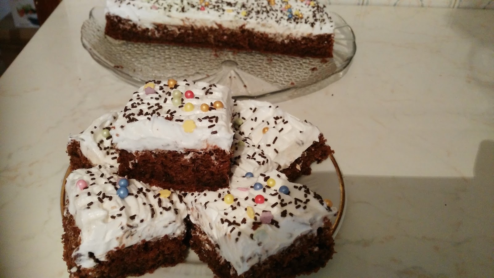 Sve dobro izjednačiti, sipati u podmazan pleh i peći na 180 stepeni C 30 min. Vruć kolač preliti glazurom od čokolade ( čokolada, kockica margarina i kašika ulja )