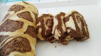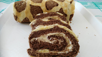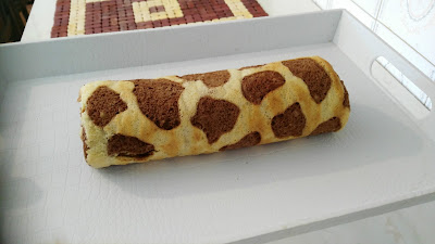 Staviti u rernu na 200 stepeni C 1 min da se samo malo stegne. U preostalu masu dodati kakao pa preliti preko zapečenih šara i peći još 20 min na 180 stepeni C . Pečen rolat uviti u krpu ne skidajući hartiju da se dobro ohladi. Zatim skinuti polako hartiju i ponovo uviti rolat da se sasvim ohladi . Namazati po želji. Ja sam namazala belim euro – kremom ..