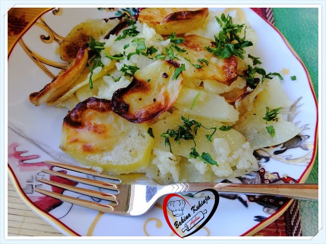 U sredinu nasecite na krugove luk opran, beli luk i pirinač. Pospite začinom i biberom. Pokriti ostatkom krompira. Zalite uljem i 200 ml vode.