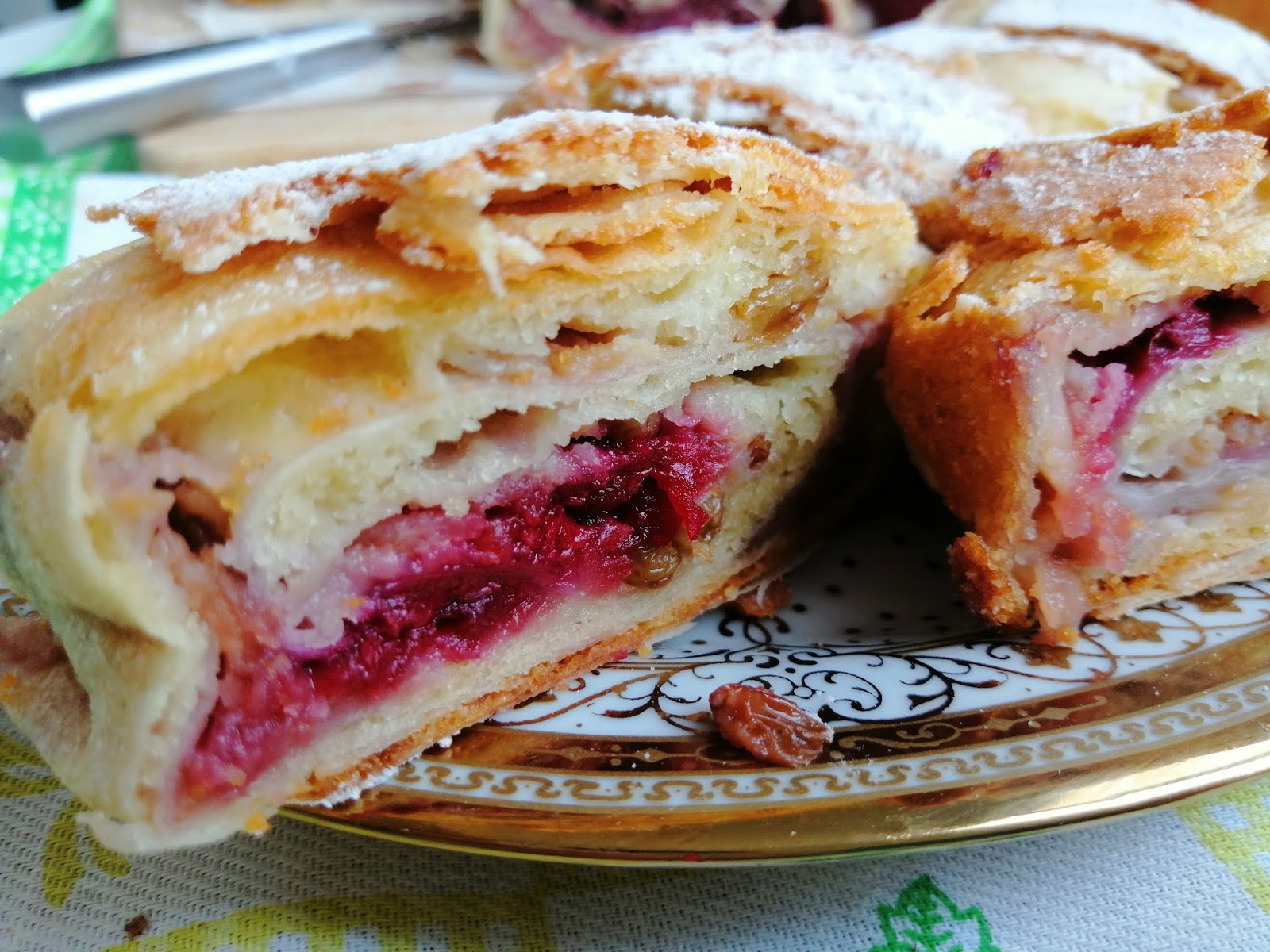 Raširiti prvu koru malo pouljiti, preko nje staviti drugu i namazati jajima, preko nje treću koru i nju premazati, i četvrtu koru takodje premazati i rasporediti jabuke sa suvim groždjem i maline saviti ivice i uviti u rolat.