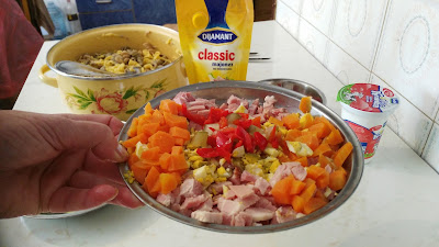 Makarone skuvati i ohladiti, a slaninu i salamu iseckati na sitne kockice.