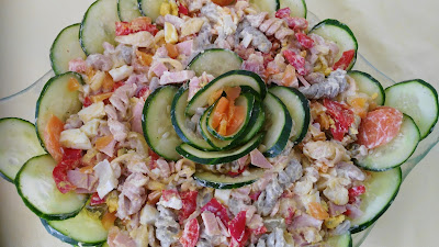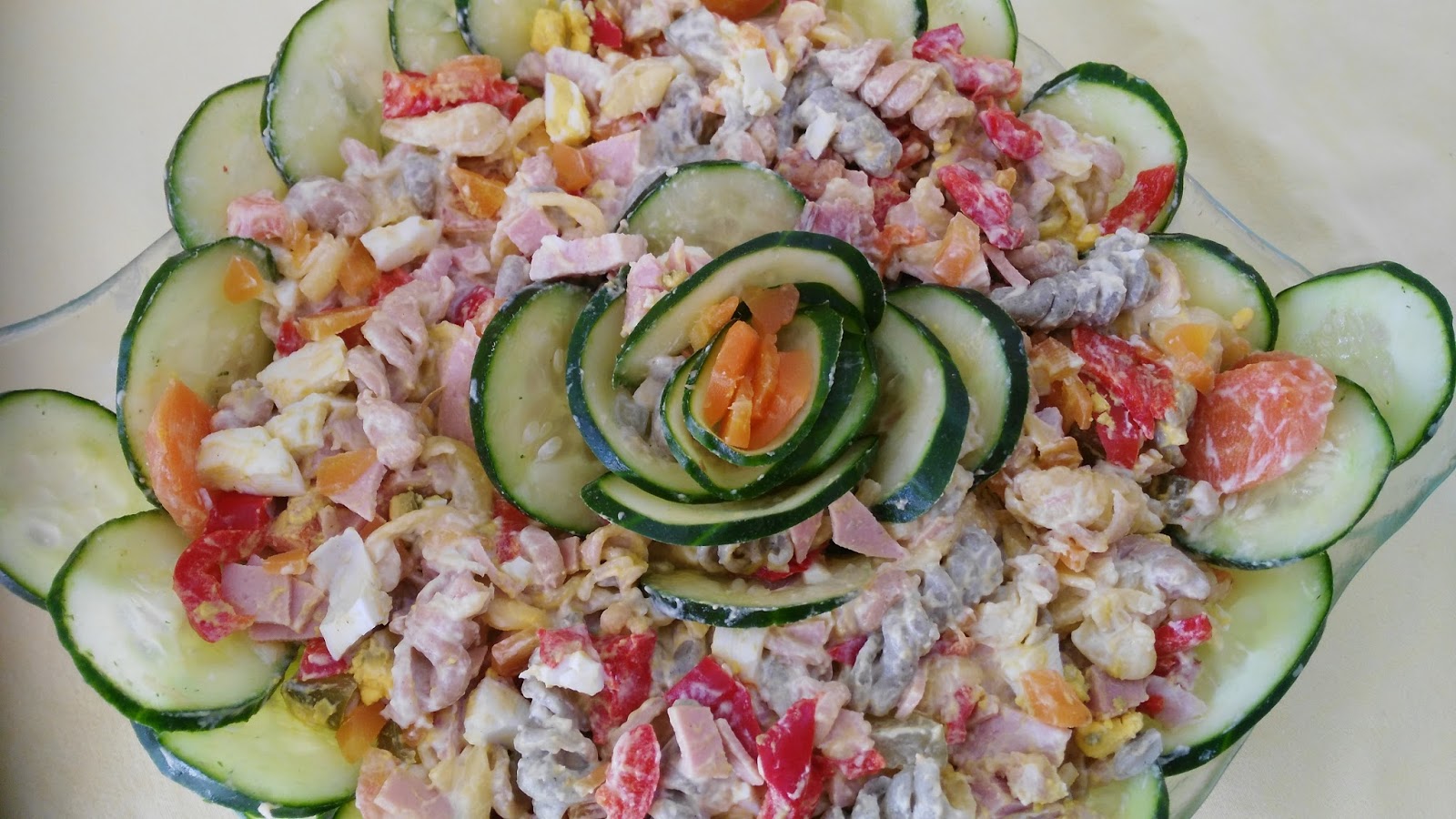 Zeleni krastavac iseći na tanke listiće pa poredjati u krug, a na sredinu oblikovati cvet oko salate. Služit prohladjeno