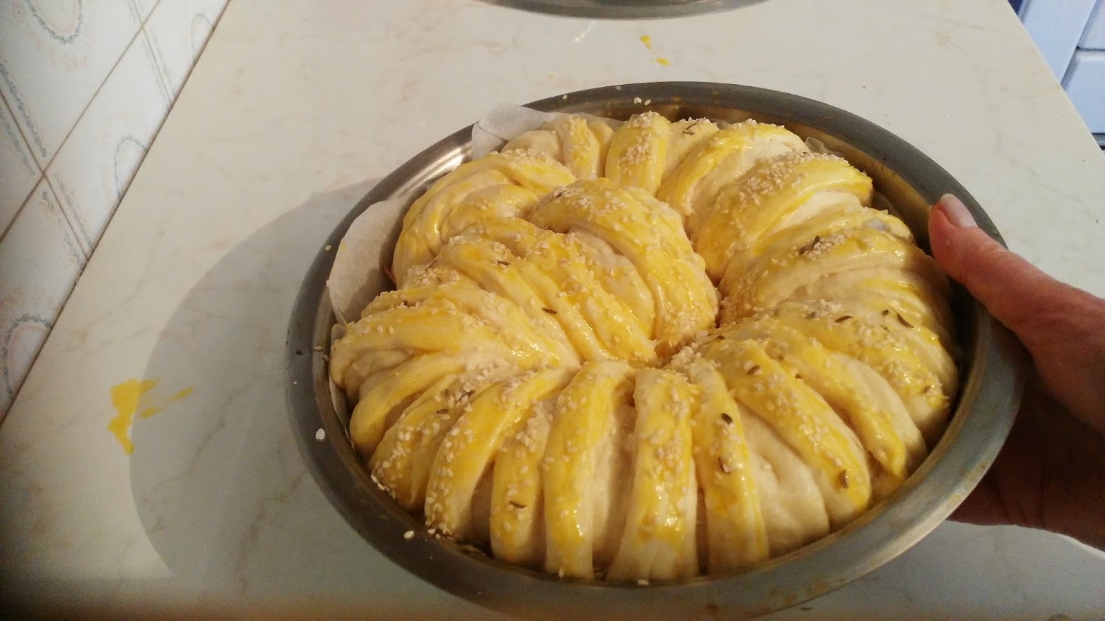 cut some rest. Twist the top down to the bottom fold in the circle and put in a round baking tray lubricating oil. Let it grow, coated with egg yolk and sprinkle with sesame seeds and coarse salt. Bake at 180 degrees C for 40 min.
