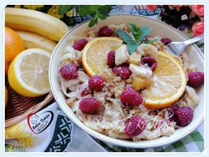 Na ocedjenu testeninu dodati prže e prezle. Dodati orah seckan, seckanu na kockice narandžu, seckanu bananu koju ste poprskali sa sokom limuna. Dodati med, maline i sve izmešati. Po želji zasladiti još… Ukrasiti kolutovima narandže… Uživajte…