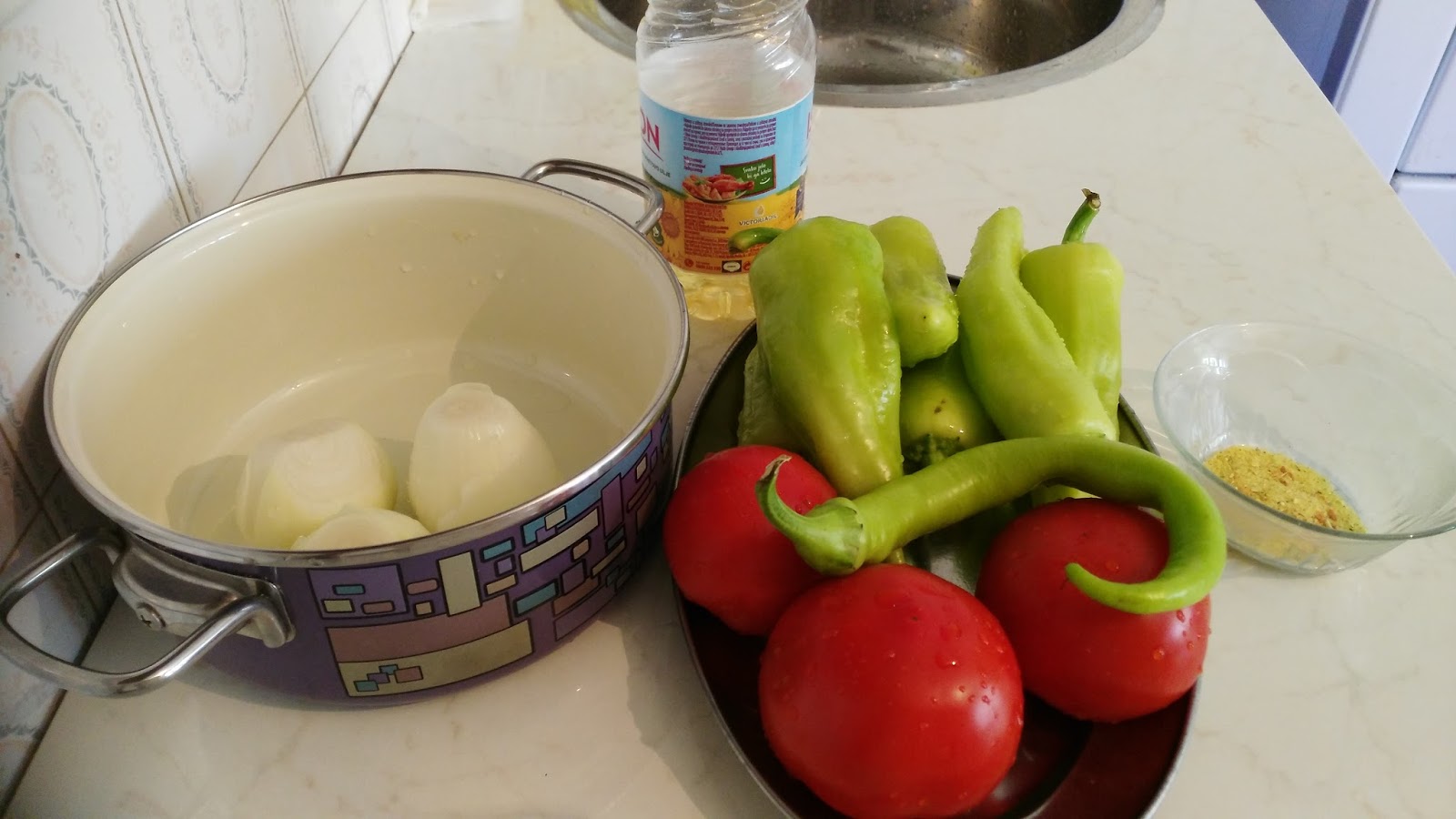 Luk iseči na kockice sitno, pa dodati pola šoljice ulja i pržiti da dobije staklastu boju, dodati isečenu papriku i malo ljute paprike po želji. Pržiti dok sve ne omekani, dodati paradajz, začin i pržiti jož 5-6 min i sataraš jegotov. Prijatno