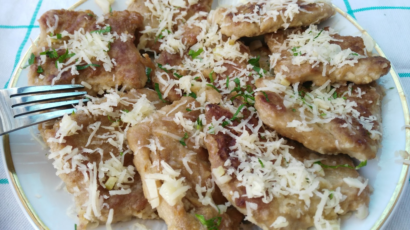 U tiganj sipati za 1/2 šoljice ulja pa kad se ugreje prepržiti šnicle sa obadve strane, a zatim ih izvaditi i poredjati u šerpu naliti vinom i naseckati ostatak belog luka poklopiti da se još krčkaju na tihoj vatri. Kad vino ispari skloniti sa vatre neka se prohlade pa narendati kačkavalj i staviti seckan peršunov list.. Prijatno!