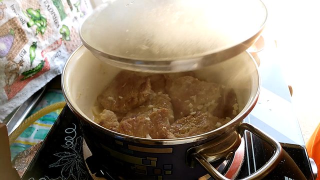 In a pan pour in 1/2 cup of oil so when warm fry steak with both sides, and then take them out and stow it in a pan pour the wine and naseckati rest of garlic hang to still simmer over low heat.