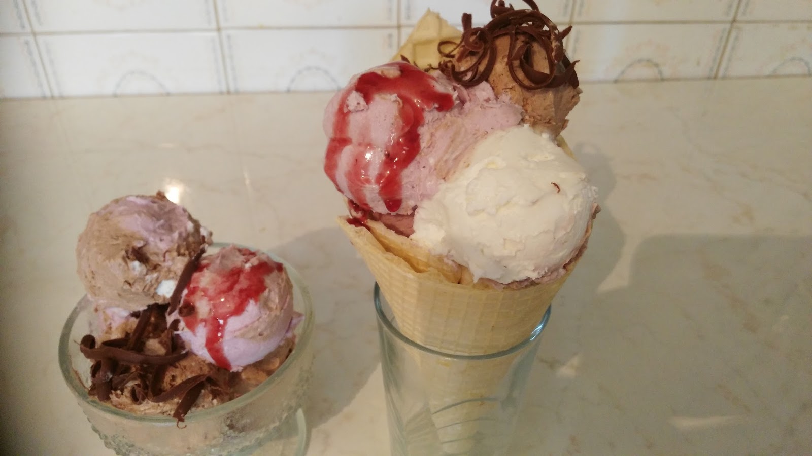 Sladoled razliti u činiji staviti u zamrzivač oko 3 sata a zatim vaditi kašikom za sladole u kornete i sladiti se…