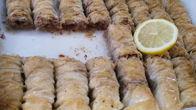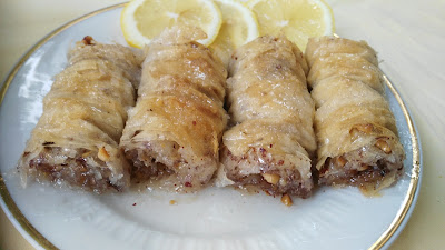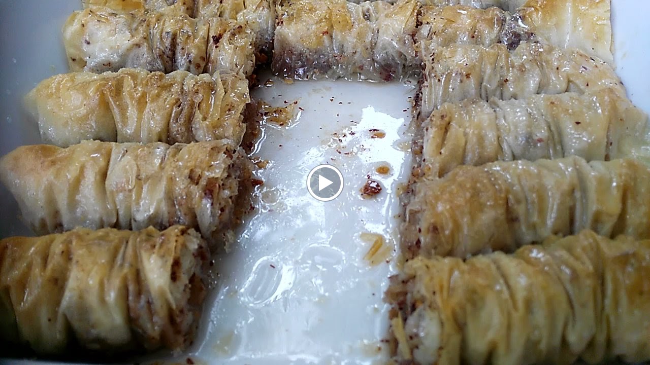 Kore zatim navijete na tanku oklagiju pa jeskupite , skinete tako skupljenu i stavite u podmazanu tepsiju. (pogledaj Video). Tako uradite i sa ostalim korama. Rolnice premažete odozgo uljem i stavite da se peku na 180 Stepeni C oko 80 min. da porumene. Kad ste ih izvadili onako vruće ih isečete na željenu dućžinu. U šećer sipajte šoljicu vode dodajte vanilin šečer i sok od limuma i ušpinujte pa prelite baklavu .Može vruće navruće. Kad se prohladi sladite se