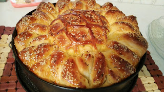 Dissolve yeast in milk we add sugar, then add the remaining milk, yogurt, oil, flour, salt. and knead the dough medium hardness. Leave to rise a little hook, but cut a smaller ball, and then a few more that we put in the middle. Manju ball to develop thinner and cut the mesh with a roller. If you do not have stones cut thin strips and isprekrštajte around the ball, which is at the center of the pan. The rest of the dough to develop the eye lubricated finger thickness softened margarine and urolovati. Rolls put in a baking dish around the balls that stands on the environment. Scissors to cut a roll finger thickness al and not to the end time and switch to a single time on the other side as the Video. Grease a loaf of egg yolk and sprinkle semenakama (sesame, caraway seed flax) Bake at 180 degrees C for about 40 min.
