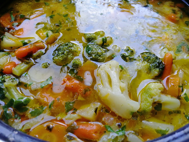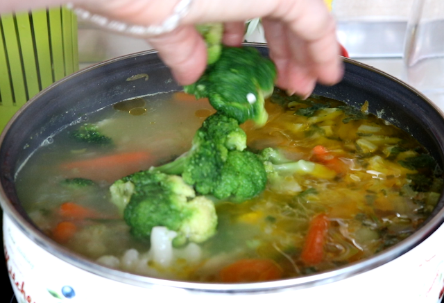 Dodati opran pirinač i njega kuvati oko oko 5 min. i na kraju dodati brokoli i karfiol. Kuvati još 5-6 min.