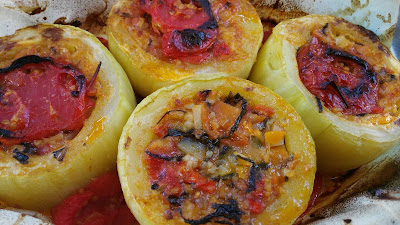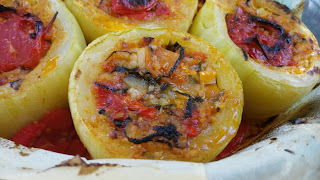 Polriti ih kolutovima paradajza malo pouljiti pokriti folijom i staviti da se peku na 200 stepeni C