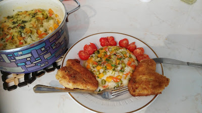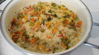 Chop all the vegetables. Fry the onion in the oil and slowly add one by one chopped vegetables and finally add the rice and pour the water in which you boiled soup cube. Cook over very low heat. Towards the end add spice, pepper and chopped parsley should not be mixed but can only shake lightly. When the liquid evaporates pilaf is ready. Serve as a side dish with meat. I’ve served with fried chicken wings. Pleasant!