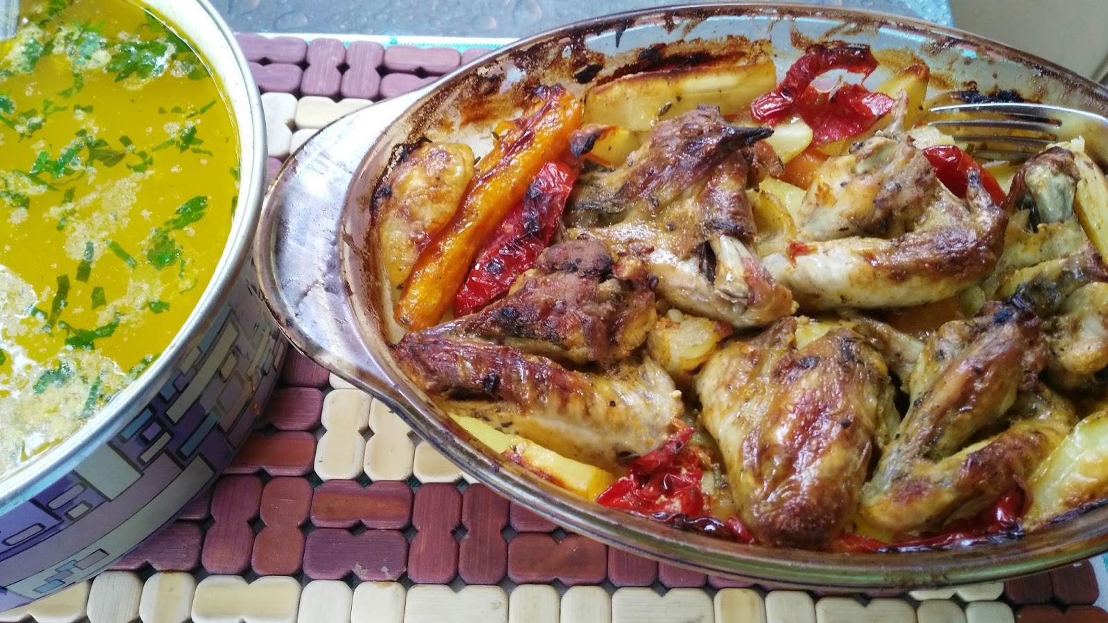 . Krompir iseći na kriške sipati ulja, i ostatak marinade koja nam ostane od krlica pa sve dobro izmešati…Tu ubaciti luk na rabarca,šargarepu i paštrnak i paradanz nasečen. Dodati šoljicu vode poklopiti i staviti u rernu na 200 stepeni C oko sat vremena da se peče i lepo porumeni..