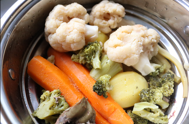 Povrće očistiti oprati pa staviti u šerpu koja ima dodatni deo sud sa rešetkom.Dodati i pileću džigericu ili pileće batazake.