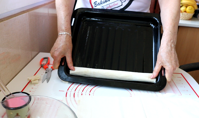 Sve suve sastoje izmešati orah,plazmu,griz,suvo groždješećer, ulje i dodati mlaku vodu. Prvu koru premazati uljem ćetkicom po celoj površini, dodati drugu pa i nju premazati, dodati treću i nju premazati po širini staviti u dno nadeva oko 3 kašike i izjednačiti .