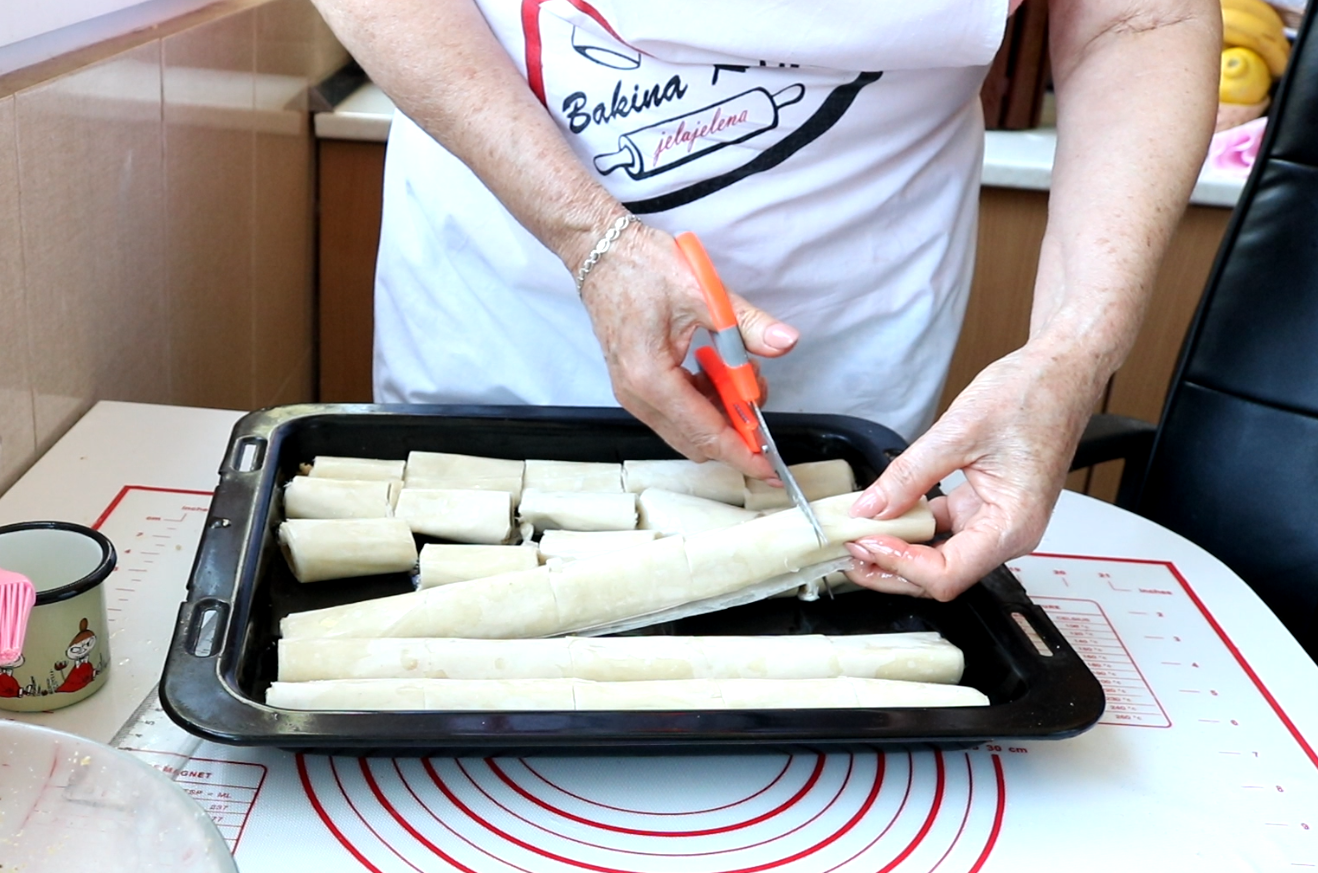 Tako uraditi sa svim korama. Iseći oštrin nožem na željene rolnice premazati rolnice uljem.