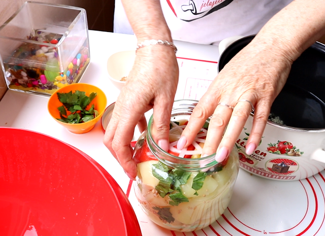 Pritisnuti plastičnim pretiskačima. Preliti rastvorem u kome se kuvala paprika. Zatvoriti.