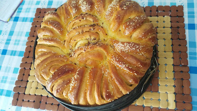 A roll cut with scissors or a knife 2 samtimetara width and arrange in greased baking pan, leaning on each other. Yolk mixed Shammah brush coated with oil but loaf and sprinkle with sesame seeds and leave to rise for about 15 min. Bake in oven at 180 degrees C 40 – 45 mi ..