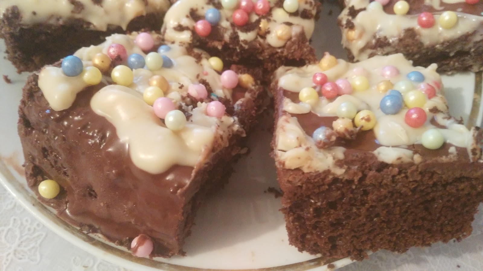 Kolač možete vruć premazati odozgo džemok pa preliti čokoladom ili preliti samo čokoladom. Odličan je sočan i i izvarednog je ukusa. Ja sam kombinovala crnu i belu čokoladu odzgo.. Sladite se.