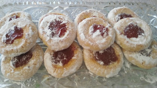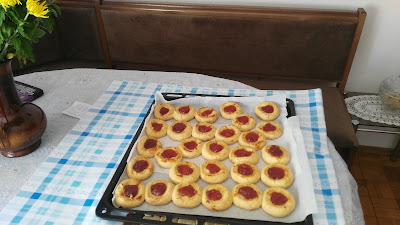 Možete prstom ili malo čašicom i u to udubljenje staviti po kašičicu džema. Slagati u podmazan pleh ili možete staviti peh papir za pečenje.