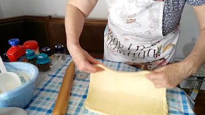 Kvasac potopiti u malo mlake vode dodati šećer, ulje, brašno, so i sve dobro umesiti da nam testo bude srednje tvrdo. Ostaviti ga na toplom da nadodje. Razviti ga prst debljine podeliti na pola pa jednu polovinu namazati margarinom i poklopiti drugom zatim opet razviti preseći poklopiti i tako 4 puta, kao što je prikazano na Videu.