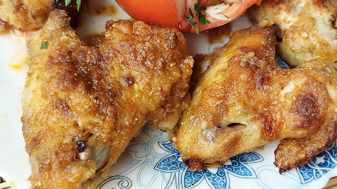 Posoljena krilca provući kroz brašno i ulje sa začinima i redjati u podmazan pleh. peći na 220 stepeni C oko 50 min da lepo porumene.