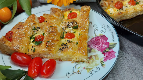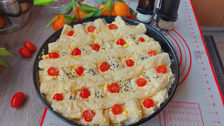 Izmedju stavljati kašičicu tvrdog sira i žumance i po malo seći paradajza čeri. Premazati uljem sve i preliti ostatkom fila. Posuti malo susamo peći na 200 stepeni C oko 50 do sat vremena. Seči i uživati u savršenbom ukusu..