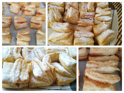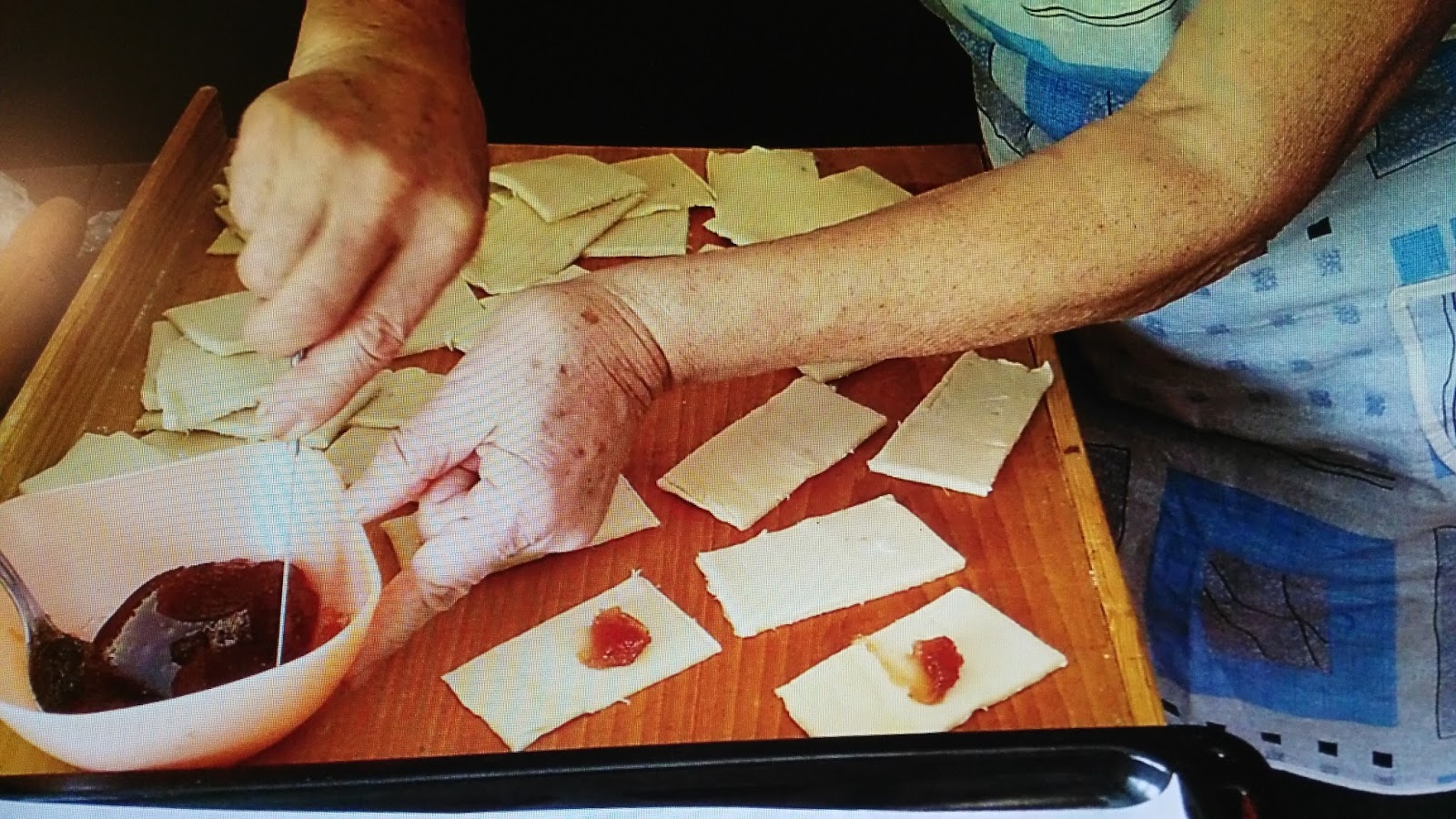 Kad je treći put namazano i odmaralo razviti ga što tanje i seći po želji ( ja sam sekla pravougaonike) stavljati džem presaviti i pritisnuti prstom ispod džema malo da džem ne iscuri.