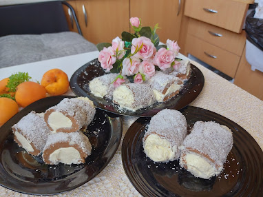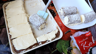 Iseći nožem najpre po sedini dužem delu pa po širini na trake . Špatunom polako podignuti početni djeo pa uvitimale rolate. Pri uvijanju malo puca ali tako mora pa pospite kokosom preko toga Redjati u tacnu i ohladiti …. predobro..jako ukusno