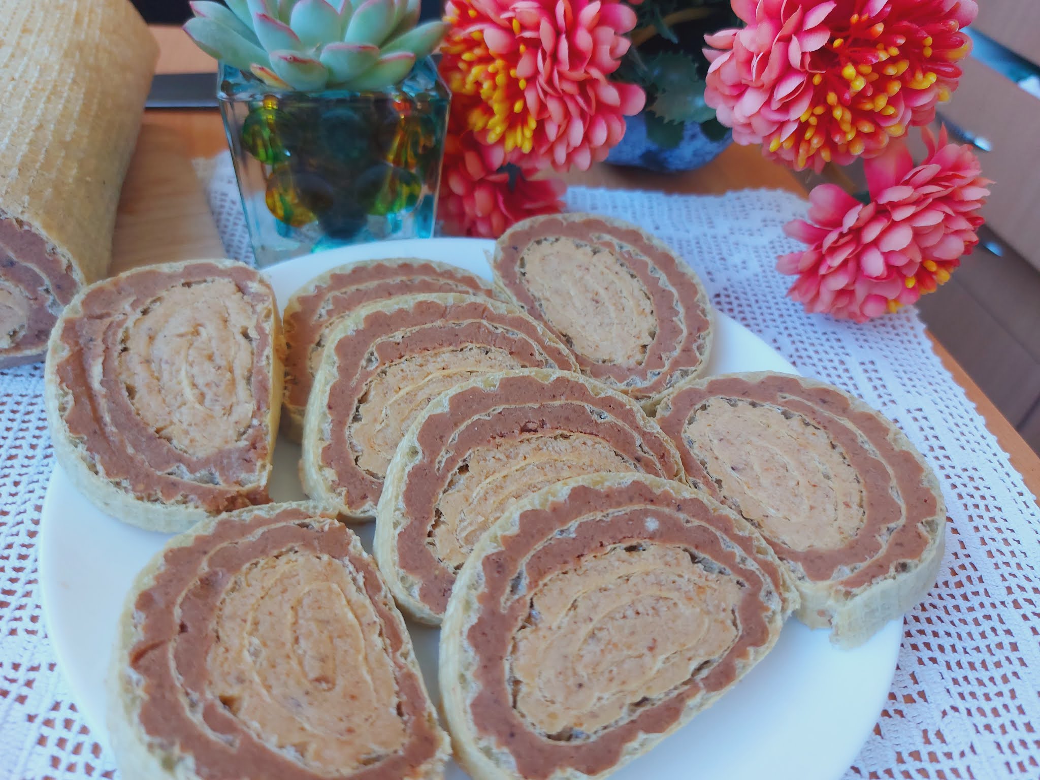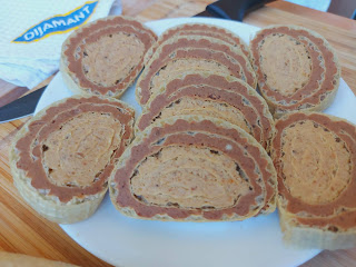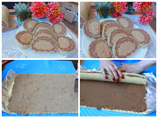 Drugu premazati čokoladni melom pa na nju staviti na ivicu uvijeni svetli deo i polako sve zajedno uviti. Ušuškati u foliju i stegnuti. Ostaviti u frižider 2 sata. Seći i sladiti sde. Prelep je..
