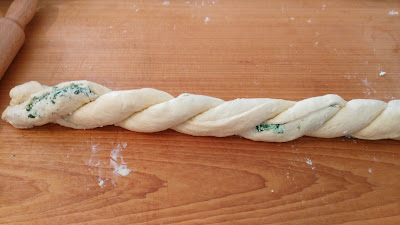 Zatim rolnicu urolovati početi prvo odozgo do sredine i odozdo do sredine Kad smo uvili rolnice se sastave u sredinu i onda nožem resečemo sredinu. Obe ronice sastavimo u vrhu i uvijemo ih kao pletenicu i stavimo u pleh.