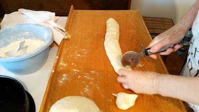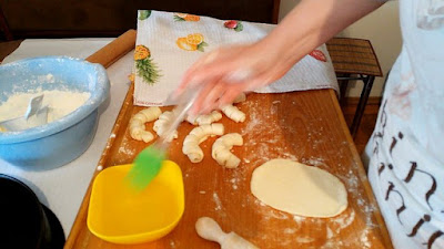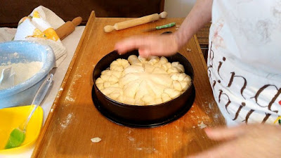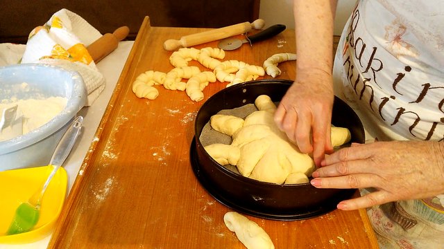 U sredinu stavimo onaj deo što je postrani i stavimo u sredinu pleha i zasečemo ivice na osam dela a kifle uvijene u rolat redjamo tako da formiramo trouglove oko kruga.