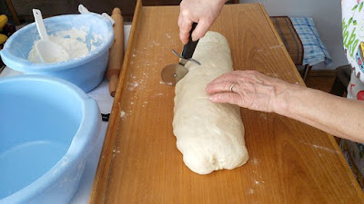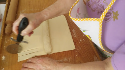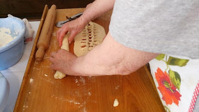 po sredini celom dužinom i uzeti kažiprstom prvu trakicu isečenu i provući kroz sledeeću i tako redom a zatim prebaciti preko valjka a ostatak testa podvući pod valjak