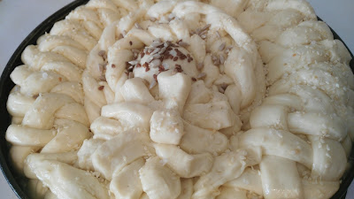 To stavimo u sredinu do pletenice. Ostala je sama sredina tu stavite malu lopticu od testa. Ispod pletenice u dnu tepslije napravite cvetić i stavite .