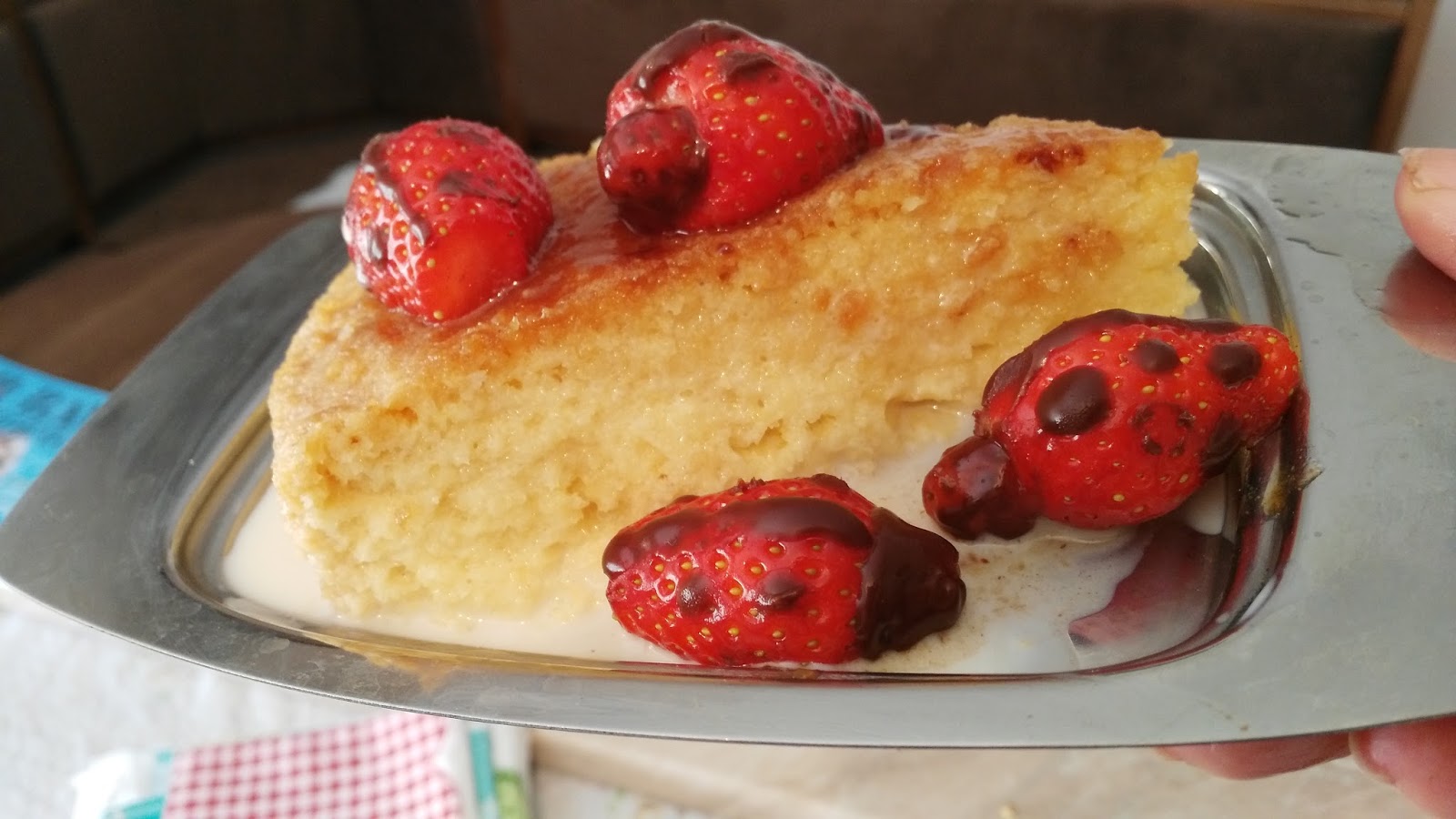 Skuvati mleke dodati šećera po želji i vanilin šećer, pa kad provri sipati vruće na kolač i pustiti da lepo upije. U šerpu staviti šećera istopiti i pretvoro u karamel pa sipati100 ml mleka i pustiti da se sav karamel istopi i zgusne i preliti kolač karamelom. Kolač možete odozgo ukrasiti još i ščagom ili voćem…