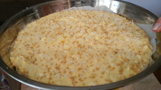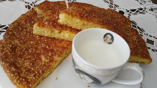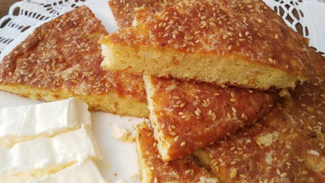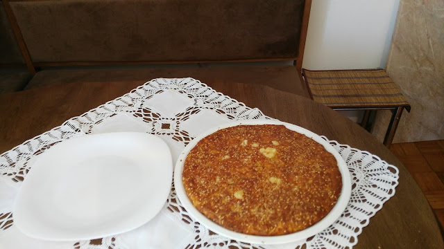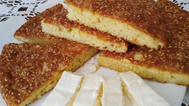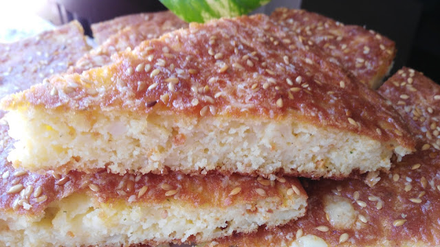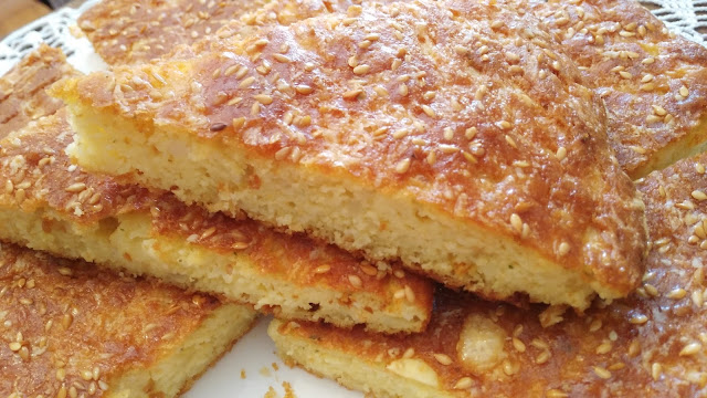 Jaja umutiti mikserom dodati sve navedene sastojke dobro izmešati i sipati u podmazan pleh (30 sm)Odozgo narendati kačkavalja i posuti susamom.