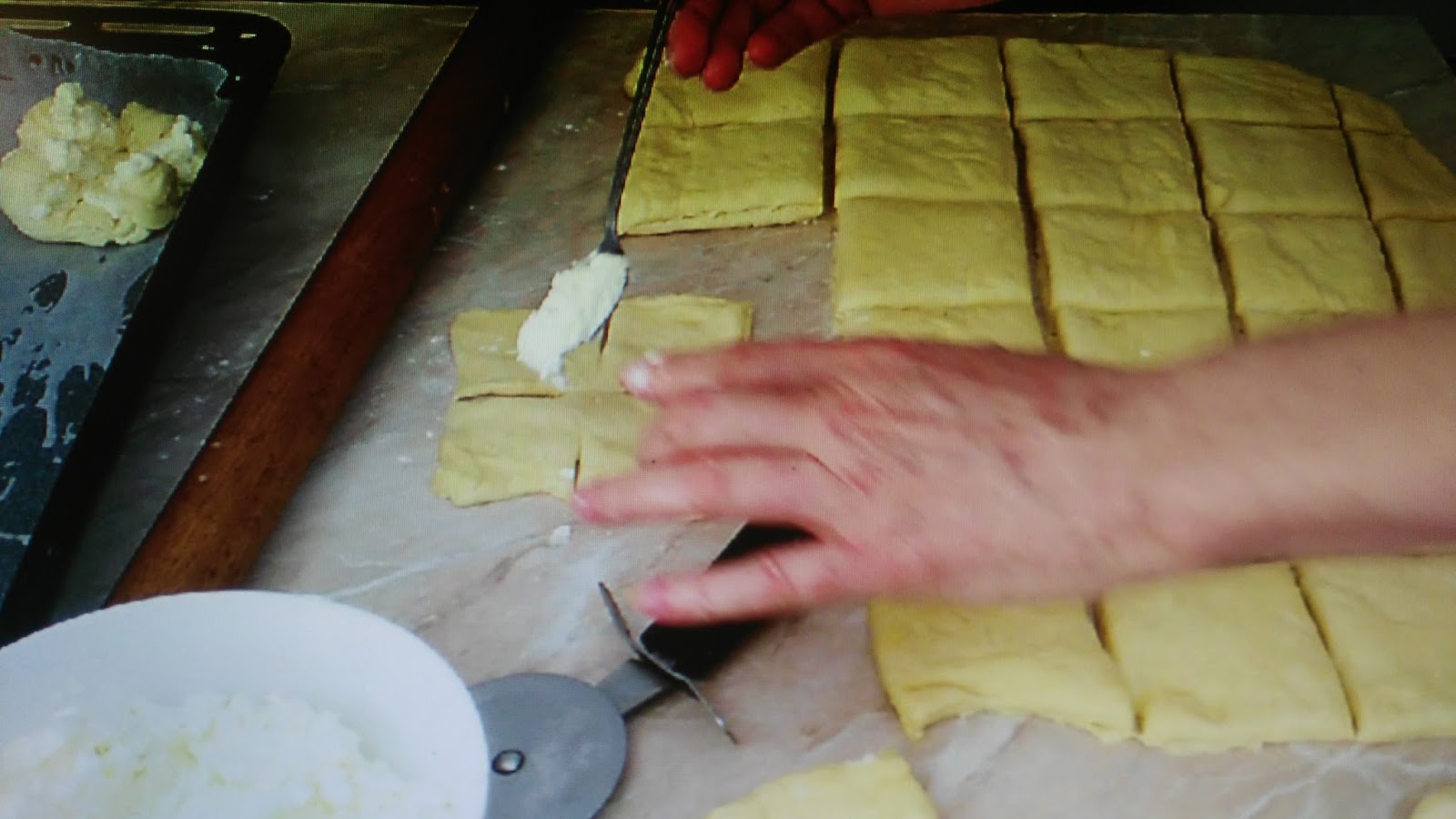 Testo razviti oklagijom izrezati na kocke pa nožem za picu iseći kao na slici. Sir izgnječiti i staviti belance i izmešati pa staviti sir