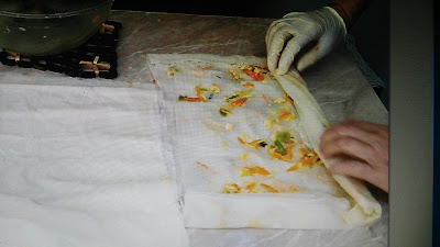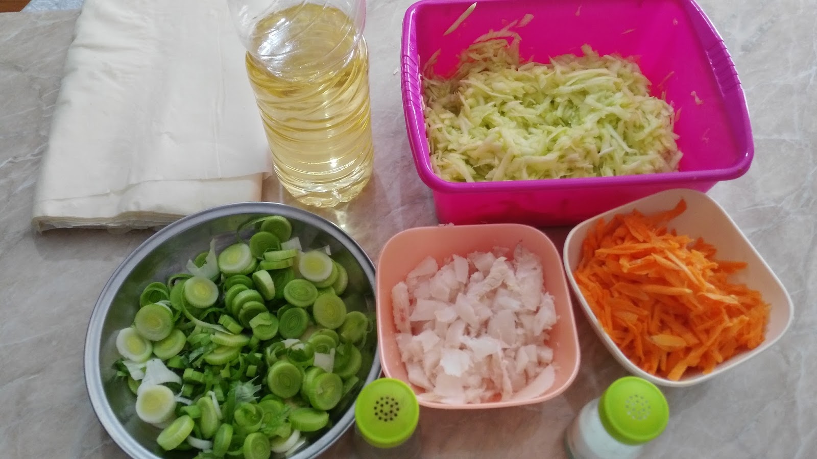 Prvu tanku koru raširiti na sto pa je malo pouljiti, odozgo preko nje staviti drugu, pa rukama malo rasporediti spremljenog fila, a zatim i četvrtu koru i na nju rasporediti uprženog oslića. Saviti krajeve pa uviti u rolnicu i staviti u podmazan pleh. Tako raditi do utroška materijala.