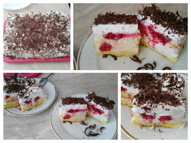 Umutiti maslac može se dodati 2-3 kašike prah šećera, pa kad se krema ohladi sjediniti sa umućenim maslacom. Biskvit iseći na trake širine oko 2 sm a dužine koliki je poslužavni. Poredjati prvi red traka po dužini poslužavnika pa sipati malo kreme, i odozgo maline rasporediti pa opet kreme, zatim poredjati trake biskvita ali sad popreko i sipati opet kreme, zatim maline i odozgo kad se krema malo ohladi i stegne ukrasiti šlagom. Dobro je ohladiti najbolje preko noći u frižiuderu da upije i lepo se stegne, i onda seći. Fantastičnog je ukusa tako osvežava.