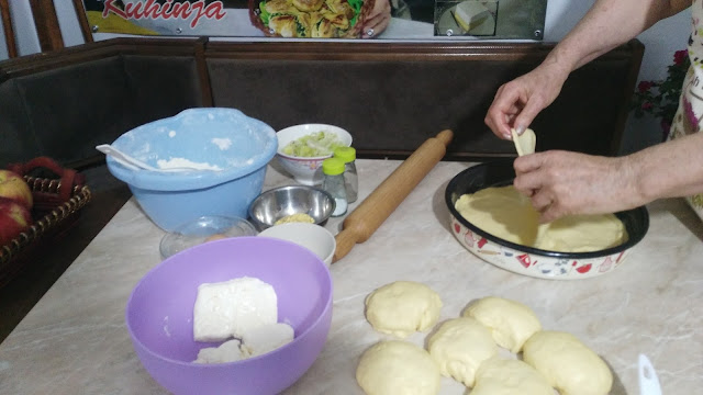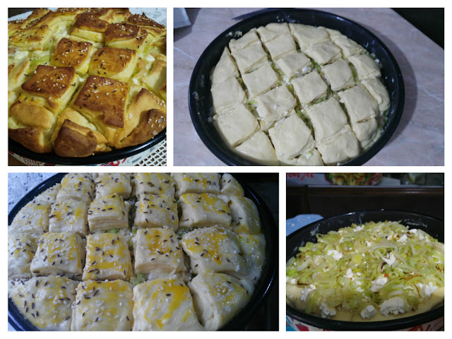 Na treću koru koju smo namazali dodamo pola izdinstanog i izmrvljenog proprženog praziluka, . Zatim opet razvijamo tri kore i mažemo margarinom i na treću dodamo drugu polovinu luka i sira. Razvijamo i mažemo i zadnje tri kore i stavljamo preko nadeva . I treću odozgo premažemo margarinom. Umutimo žumance i malo premažemo.