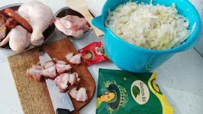 Na masti ispržiti sitno seckan luk pa dodati seckanu slaninu i kobasice. Kad se uprže dodati sirovo meso, piletinu i krmenadne.