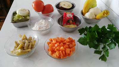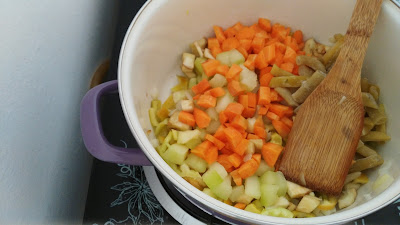 Ispržiti luk, i papriku pa dodati ostalo povrće i dinstati.