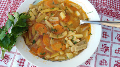 Dodati alevu papriku i ljutu papriku i zapržiti boraniju. Didati začin i sitno seckan list celera. Služiti malo prohladjenu uz neku salatu i kiselo mleko