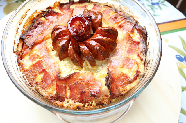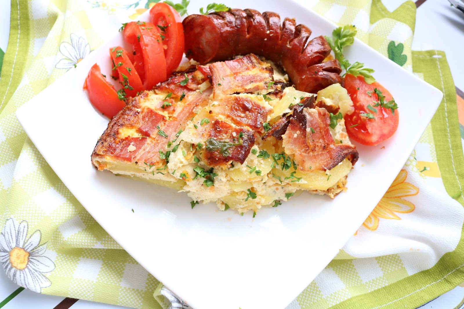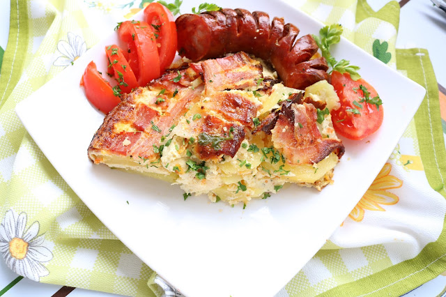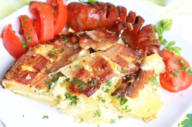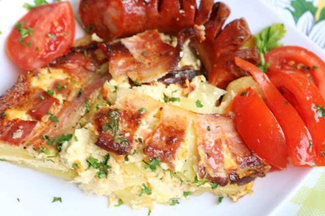 Slaninu rasporediti preko krompira i peći na 200 stepeni C da porumeni oko 40 min.Ja sam dodala malo i dimljene kobasice.