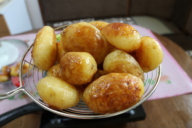 Vatru smanjiti na minimum da krompir na sopstvenoj pari omekne. Zatim povećati i krompir lepo zapeći da lepo porumeni sa svih strana. Rešetkastom kašikom povaditi krompir u činiju .