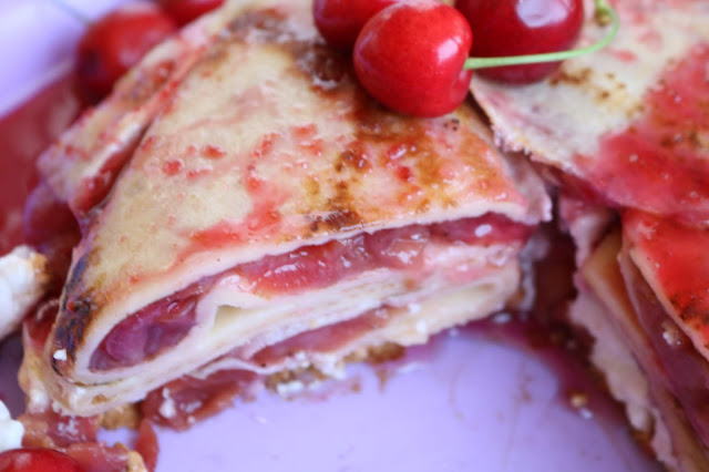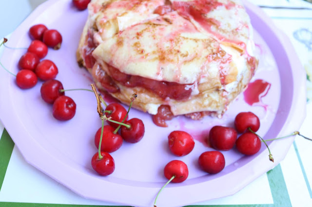Ispeći palačinke a u trešnje sipati vodu jedan vanilin šećer i šećer po želji i kuvati 10-15 min da voda uvri polovinu.