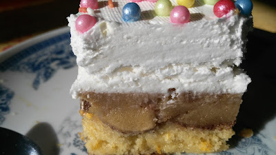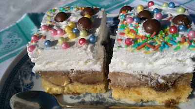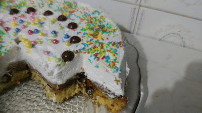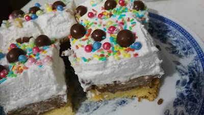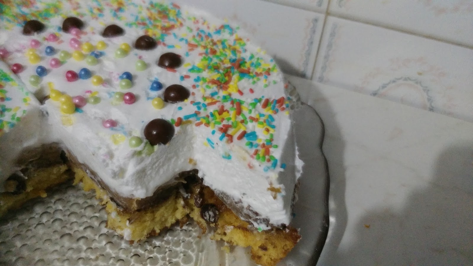 Pečen kolač izvaditi iz pleha kad se ohladi i ukrasiti ga sa 300 gr šlaga