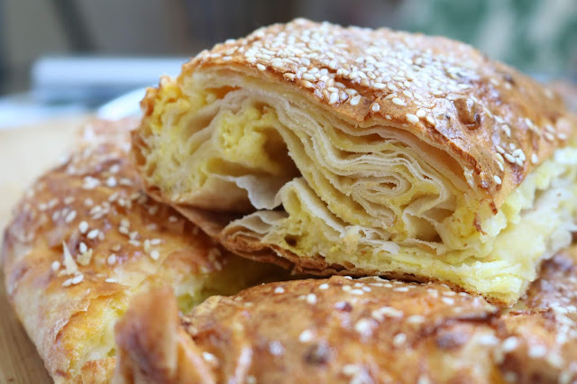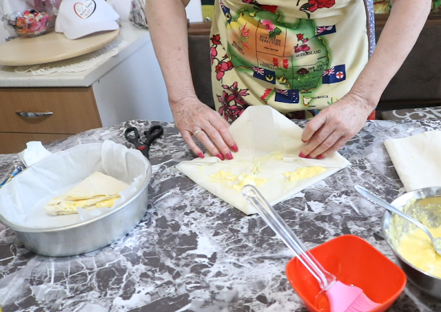 Pouljiti i saviti i opet preklopiti. Redjati u okrugli pleh. Tako sve do utroška materijal tj sira.